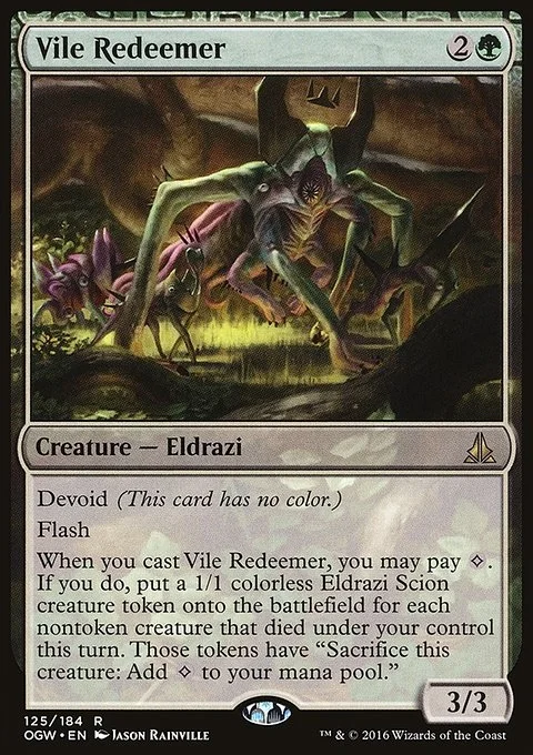 When you cast Vile Redeemer, you may pay C. If you do, put a 1/1 colorless Eldrazi Scion creature token onto the battlefield for each nontoken creature that died under your control this turn. Those tokens have "Sacrifice this creature: Add C to your mana pool."