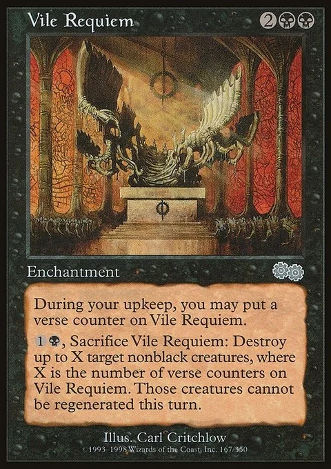 At the beginning of your upkeep, you may put a verse counter on this enchantment. {1}{B}, Sacrifice this enchantment: Destroy up to X target nonblack creatures, where X is the number of verse counters on this enchantment. They can't be regenerated.