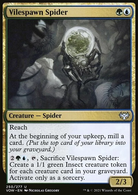 {2}{G}{U}, {T}, Sacrifice Vilespawn Spider: Create a 1/1 green Insect creature token for each creature card in your graveyard. Activate only as a sorcery.