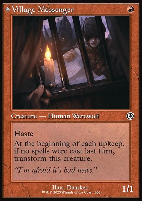 Village Messenger Haste At the beginning of each upkeep, if no spells were cast last turn, transform this creature. Moonrise Intruder Menace (This creature can't be blocked except by two or more creatures.) At the beginning of each upkeep, if a player cast two or more spells last turn, transform this creature.