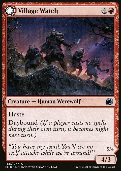 Village Watch Haste Daybound (If a player casts no spells during their own turn, it becomes night next turn.) Village Reavers Wolves and Werewolves you control have haste. Nightbound (If a player casts at least two spells during their own turn, it becomes day next turn.)