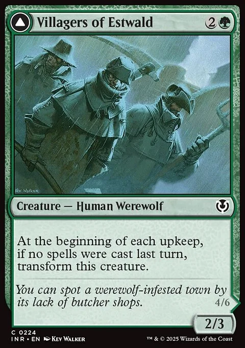 Villagers of Estwald At the beginning of each upkeep, if no spells were cast last turn, transform this creature. Howlpack of Estwald At the beginning of each upkeep, if a player cast two or more spells last turn, transform this creature.