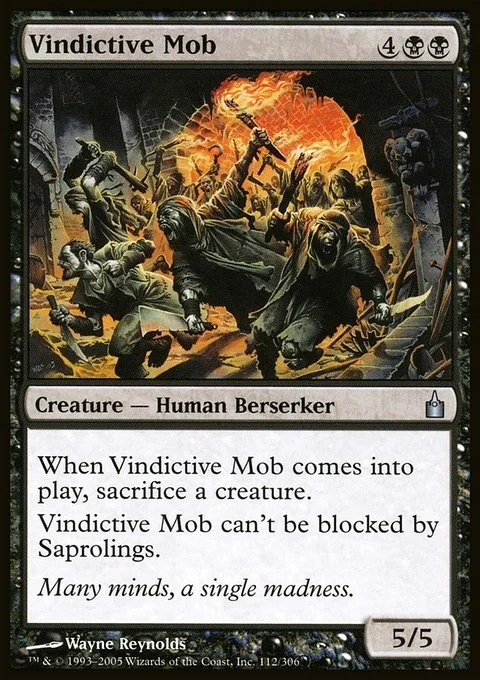 When Vindictive Mob enters the battlefield, sacrifice a creature. Vindictive Mob can't be blocked by Saprolings.