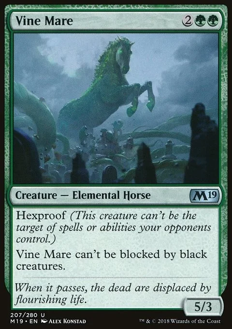 Hexproof (This creature can't be the target of spells or abilities your opponents control.) Vine Mare can't be blocked by black creatures.