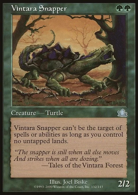 Vintara Snapper has shroud as long as you control no untapped lands. (It can't be the target of spells or abilities.)