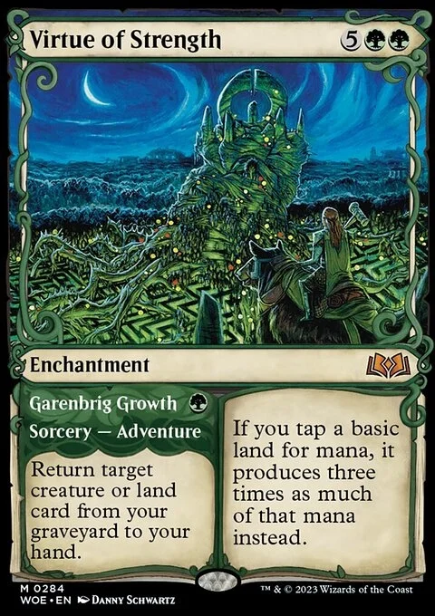 Virtue of Strength If you tap a basic land for mana, it produces three times as much of that mana instead. Garenbrig Growth Return target creature or land card from your graveyard to your hand. (Then exile this card. You may cast the enchantment later from exile.)