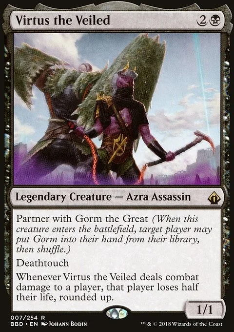 Whenever Virtus the Veiled deals combat damage to a player, that player loses half their life, rounded up.
