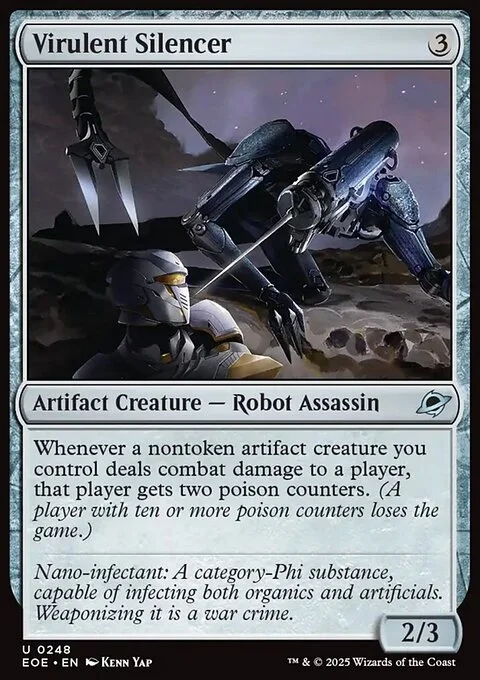 Whenever a nontoken artifact creature you control deals combat damage to a player, that player gets two poison counters. (A player with ten or more poison counters loses the game.)