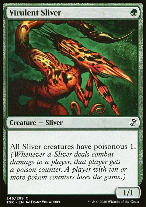 All Sliver creatures have poisonous 1. (Whenever a Sliver deals combat damage to a player, that player gets a poison counter. A player with ten or more poison counters loses the game.)