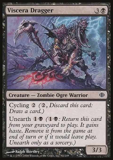 Cycling {2} ({2}, Discard this card: Draw a card.) Unearth {1}{B} ({1}{B}: Return this card from your graveyard to the battlefield. It gains haste. Exile it at the beginning of the next end step or if it would leave the battlefield. Unearth only as a sorcery.)