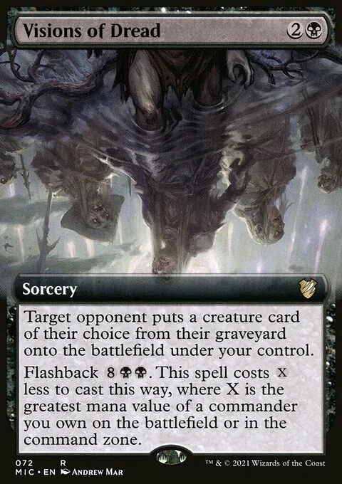 Target opponent puts a creature card of their choice from their graveyard onto the battlefield under your control. Flashback {8}{B}{B}. This spell costs {X} less to cast this way, where X is the greatest mana value of a commander you own on the battlefield or in the command zone. (You may cast this card from your graveyard for its flashback cost. Then exile it.)
