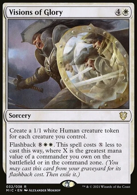 Create a 1/1 white Human creature token for each creature you control. Flashback {8}{W}{W}. This spell costs {X} less to cast this way, where X is the greatest mana value of a commander you own on the battlefield or in the command zone. (You may cast this card from your graveyard for its flashback cost. Then exile it.)