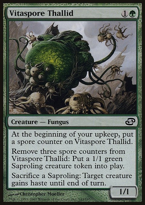 At the beginning of your upkeep, put a spore counter on Vitaspore Thallid. Remove three spore counters from Vitaspore Thallid: Create a 1/1 green Saproling creature token. Sacrifice a Saproling: Target creature gains haste until end of turn.