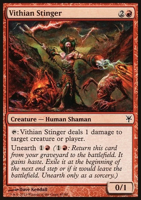{T}: Vithian Stinger deals 1 damage to any target. Unearth {1}{R} ({1}{R}: Return this card from your graveyard to the battlefield. It gains haste. Exile it at the beginning of the next end step or if it would leave the battlefield. Unearth only as a sorcery.)
