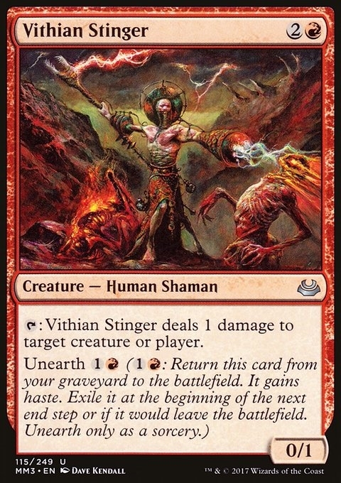 {T}: Vithian Stinger deals 1 damage to any target. Unearth {1}{R} ({1}{R}: Return this card from your graveyard to the battlefield. It gains haste. Exile it at the beginning of the next end step or if it would leave the battlefield. Unearth only as a sorcery.)
