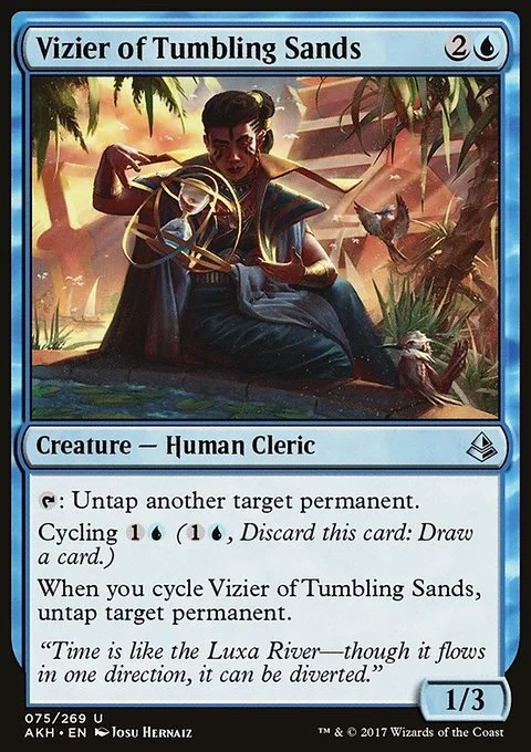 {T}: Untap another target permanent. Cycling {1}{U} ({1}{U}, Discard this card: Draw a card.) When you cycle Vizier of Tumbling Sands, untap target permanent.