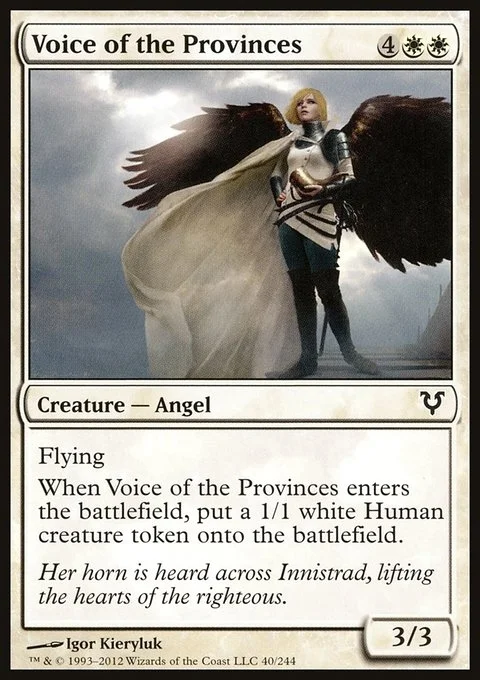 Flying When Voice of the Provinces enters the battlefield, create a 1/1 white Human creature token.