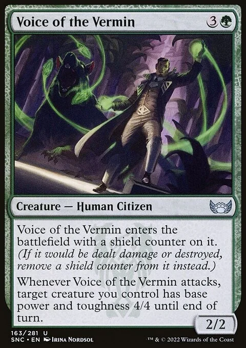 Voice of the Vermin enters the battlefield with a shield counter on it. (If it would be dealt damage or destroyed, remove a shield counter from it instead.)