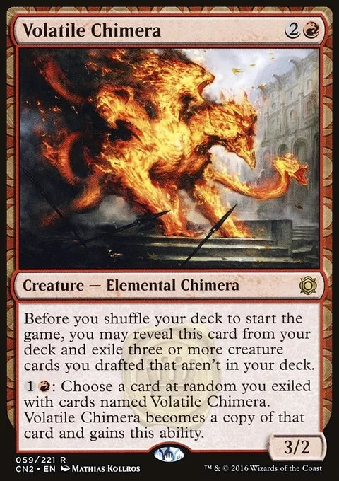 1R: Choose a card at random you exiled with cards named Volatile Chimera. Volatile Chimera becomes a copy of that card and gains this ability.