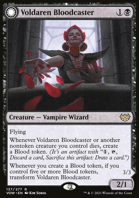 Whenever Voldaren Bloodcaster or another nontoken creature you control dies, create a Blood token. (It's an artifact with "{1}, {T}, Discard a card, Sacrifice this artifact: Draw a card.")