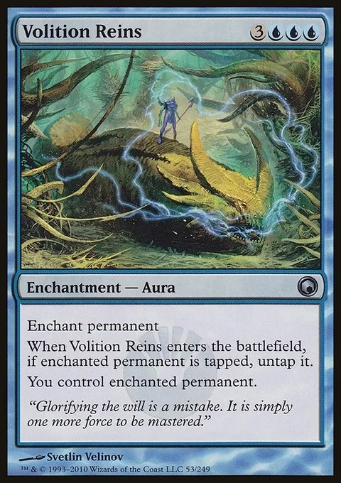Enchant permanent When Volition Reins enters the battlefield, if enchanted permanent is tapped, untap it. You control enchanted permanent.