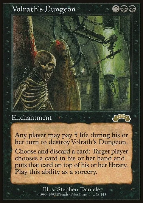 Any player may pay 5 life during his or her turn to destroy Volrath’s Dungeon.Choose and discard a card: Target player chooses a card in his or her hand and puts that card on top of his or her library. Play this ability as a sorcery.