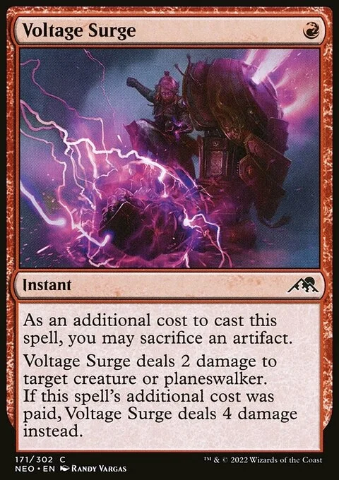 As an additional cost to cast this spell, you may sacrifice an artifact. Voltage Surge deals 2 damage to target creature or planeswalker. If this spell's additional cost was paid, Voltage Surge deals 4 damage instead.