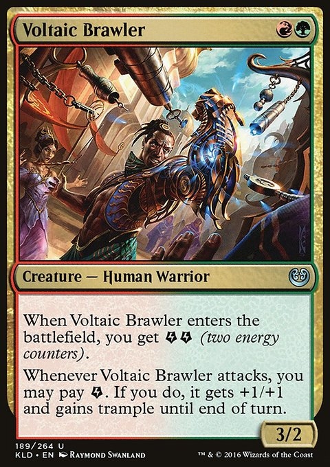 When Voltaic Brawler enters the battlefield, you get {E}{E} (two energy counters). Whenever Voltaic Brawler attacks, you may pay {E}. If you do, it gets +1/+1 and gains trample until end of turn.