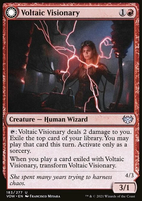 Voltaic Visionary {T}: Voltaic Visionary deals 2 damage to you. Exile the top card of your library. You may play that card this turn. Activate only as a sorcery. When you play a card exiled with Voltaic Visionary, transform Voltaic Visionary. Volt-Charged Berserker Volt-Charged Berserker can't block.