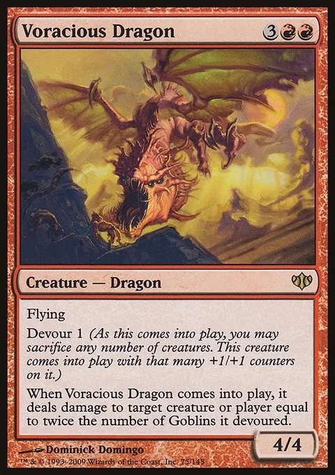 Flying Devour 1 (As this enters the battlefield, you may sacrifice any number of creatures. This creature enters the battlefield with that many +1/+1 counters on it.) When Voracious Dragon enters the battlefield, it deals damage to any target equal to twice the number of Goblins it devoured.