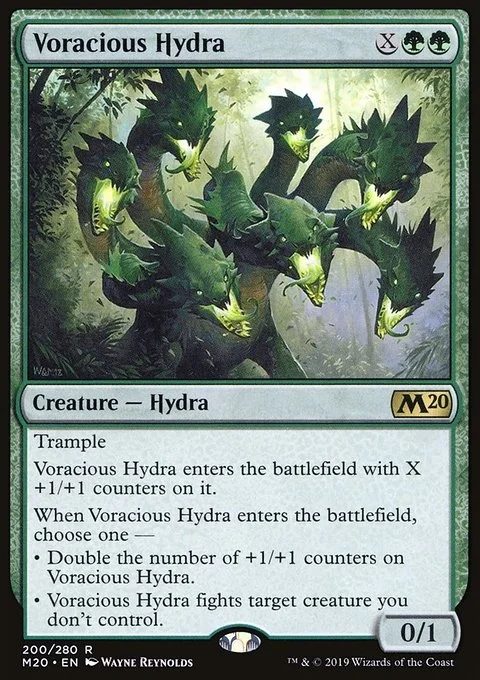 Trample Voracious Hydra enters with X +1/+1 counters on it. When Voracious Hydra enters, choose one — • Double the number of +1/+1 counters on Voracious Hydra. • Voracious Hydra fights target creature you don't control.