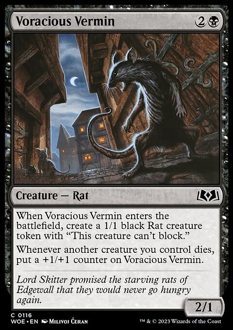 When this creature enters, create a 1/1 black Rat creature token with "This token can't block." Whenever another creature you control dies, put a +1/+1 counter on this creature.