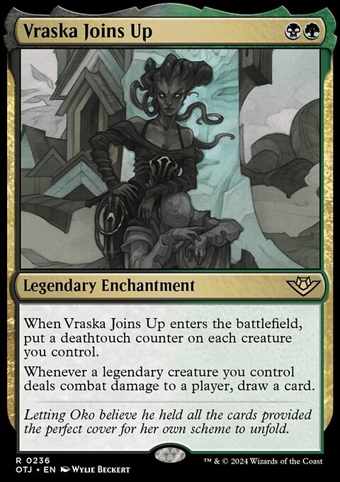When Vraska Joins Up enters the battlefield, put a deathtouch counter on each creature you control. Whenever a legendary creature you control deals combat damage to a player, draw a card.
