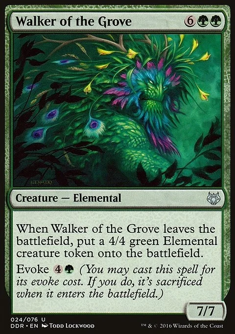 When Walker of the Grove leaves the battlefield, create a 4/4 green Elemental creature token. Evoke {4}{G} (You may cast this spell for its evoke cost. If you do, it's sacrificed when it enters.)