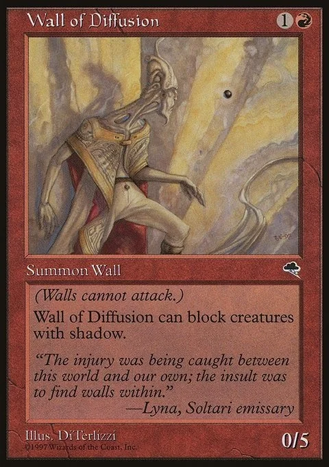 Defender (This creature can't attack.) Wall of Diffusion can block creatures with shadow as though Wall of Diffusion had shadow.