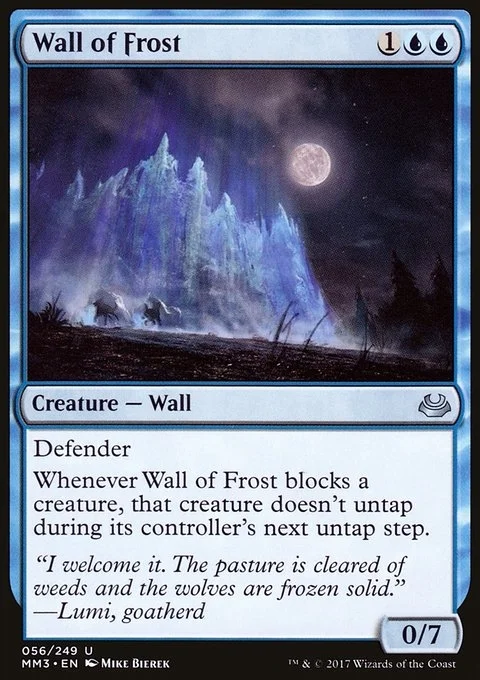Defender Whenever Wall of Frost blocks a creature, that creature doesn't untap during its controller's next untap step.