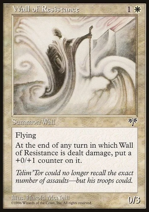 Defender (This creature can't attack.) Flying At the beginning of each end step, if Wall of Resistance was dealt damage this turn, put a +0/+1 counter on it.