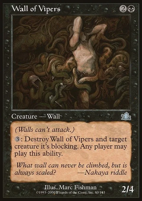 Defender (This creature can't attack.) {3}: Destroy Wall of Vipers and target creature it's blocking. Any player may activate this ability.