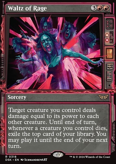 Target creature you control deals damage equal to its power to each other creature. Until end of turn, whenever a creature you control dies, exile the top card of your library. You may play it until the end of your next turn.
