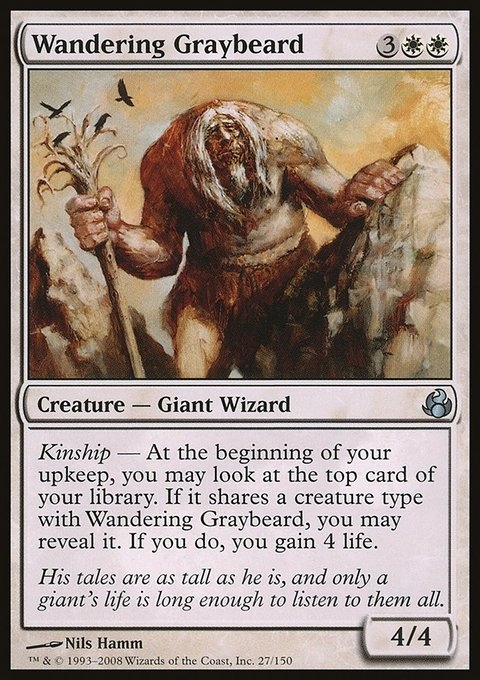Kinship — At the beginning of your upkeep, you may look at the top card of your library. If it shares a creature type with Wandering Graybeard, you may reveal it. If you do, you gain 4 life.