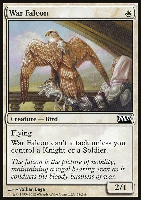 Flying War Falcon can't attack unless you control a Knight or a Soldier.