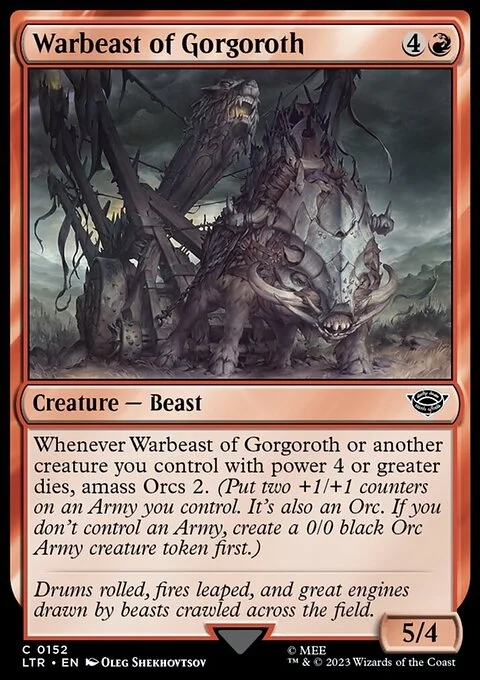 Whenever this creature or another creature you control with power 4 or greater dies, amass Orcs 2. (Put two +1/+1 counters on an Army you control. It's also an Orc. If you don't control an Army, create a 0/0 black Orc Army creature token first.)