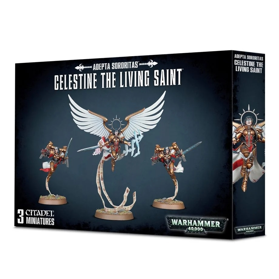 This multi-part plastic kit contains the components necessary to assemble Celestine, the Living Saint, and her 2 accompanying Geminae Superia. She wears the Armour of St. Katherine, a set of glorious golden plate replete with holy icons and sculpted symbols. The model is held aloft from the base by a scripture that attaches to her billowing cloak – even this detail is dwarfed by the enormous wings that span out from her backpack, with a spiked iron halo above her enraptured face. The sparking Ardent Blade in her right hand blossoms with roses, even as a brace of doves is released on her left. She is accompanied by the Geminae Superia, wearing similar armour (with smaller wingspans) and aggressively wielding bolt pistols and power swords.