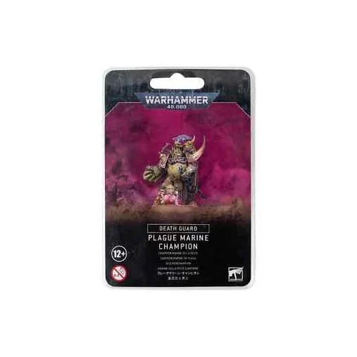 This multi-part plastic kit contains the components necessary to assemble a Plague Marine Champion, who can be added to a unit of Plague Marines. Clad in bulging, rusted power armour, he comes with a choice of two variant heads – one helmeted, and one bare (with an unsettlingly large horn growing out of his face…). Befitting his Champion status, he is decked out in chainmail, with a cloak prominently featuring the symbol of Nurgle. He is armed with a plaguesword and power fist, and includes a boltgun which hangs from his backpack. 2 Nurglings are included – one atop his shoulder, clutching a smoking censer, and one optional Nurgling for his base, comically clad in a Death Guard helmet.