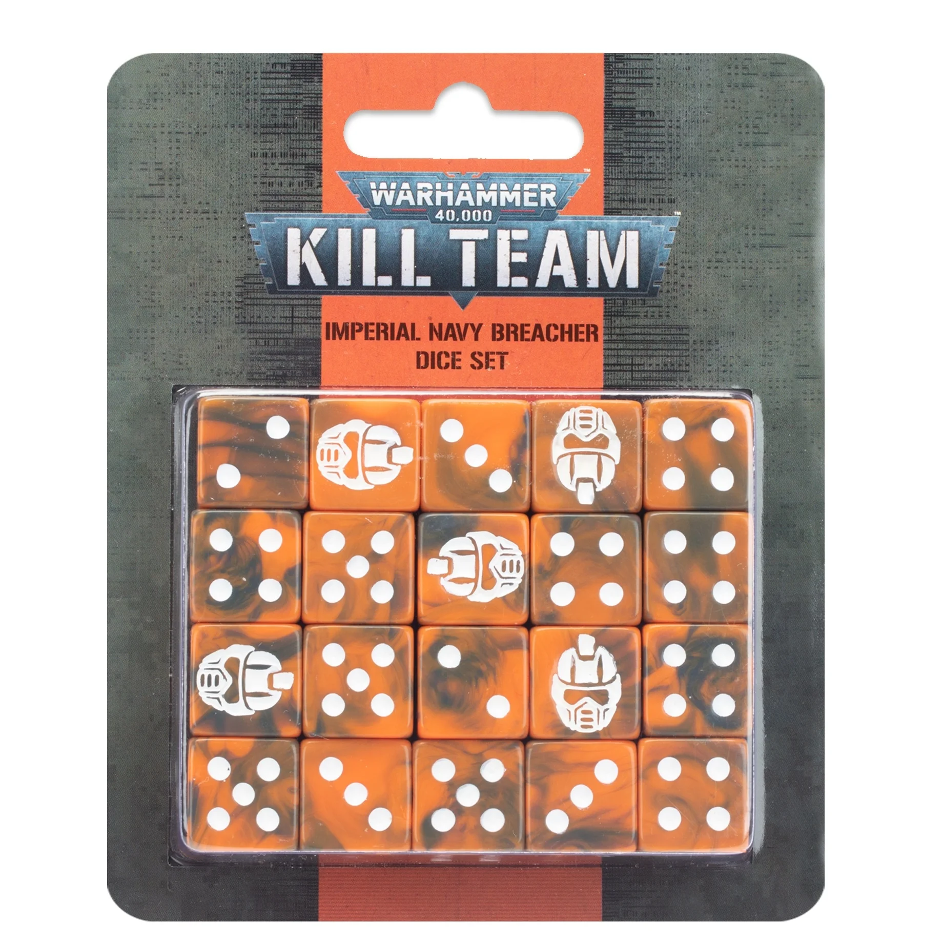 This set includes 20 six-sided dice measuring 16mm along each edge. They’re cast in an orange and grey swirl, with white pips and the helmet icon of the Imperial Navy Breachers on each 6 face.