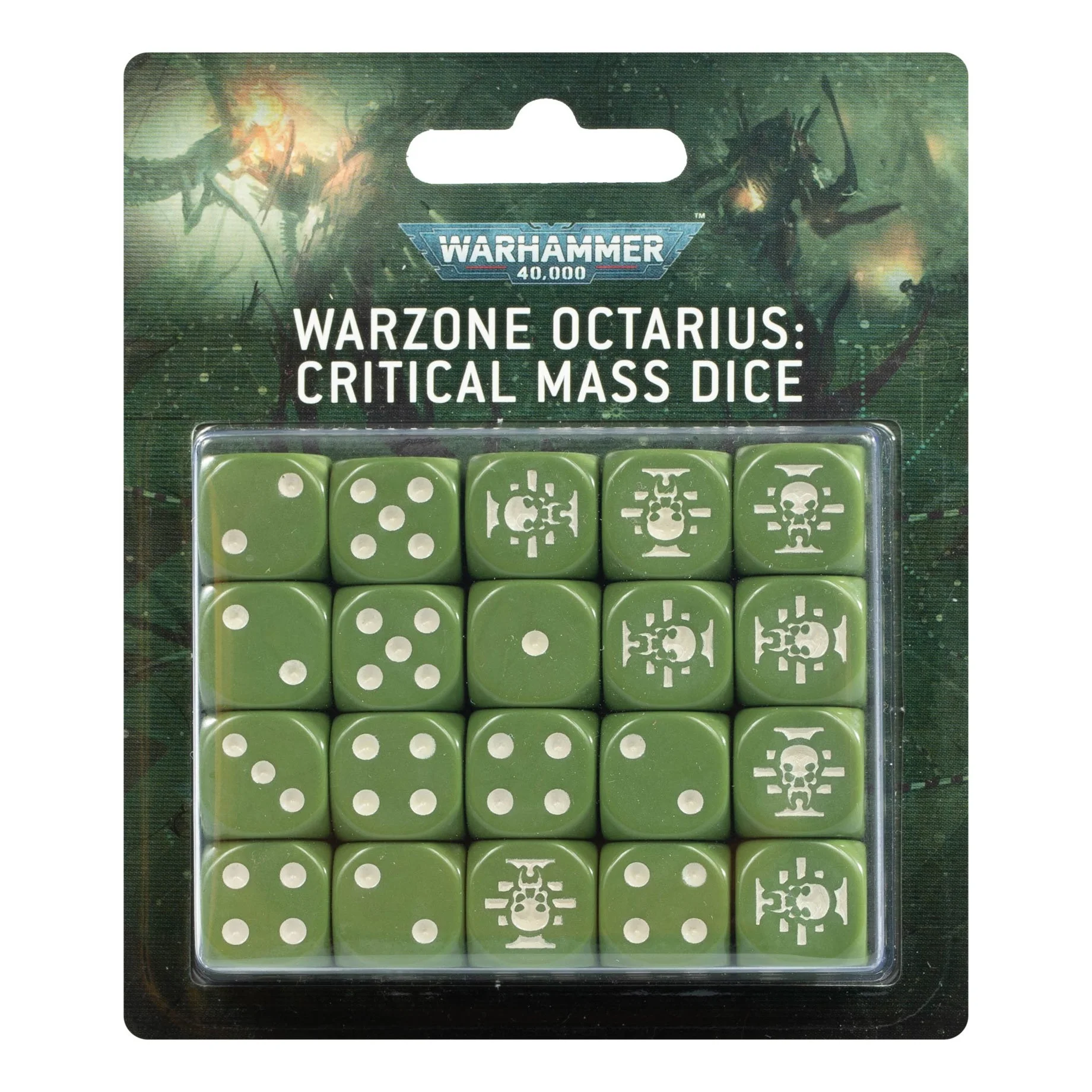Each six-sided, round-cornered die is dark green in colour with markings in off-white ink. The 20 dice in this set each measure 16mm x 16mm and feature an Ordo Xenos rosette icon on the 6 face, with traditional pips on the other faces. The dice are supplied in a blister pack with an artworked backing card.