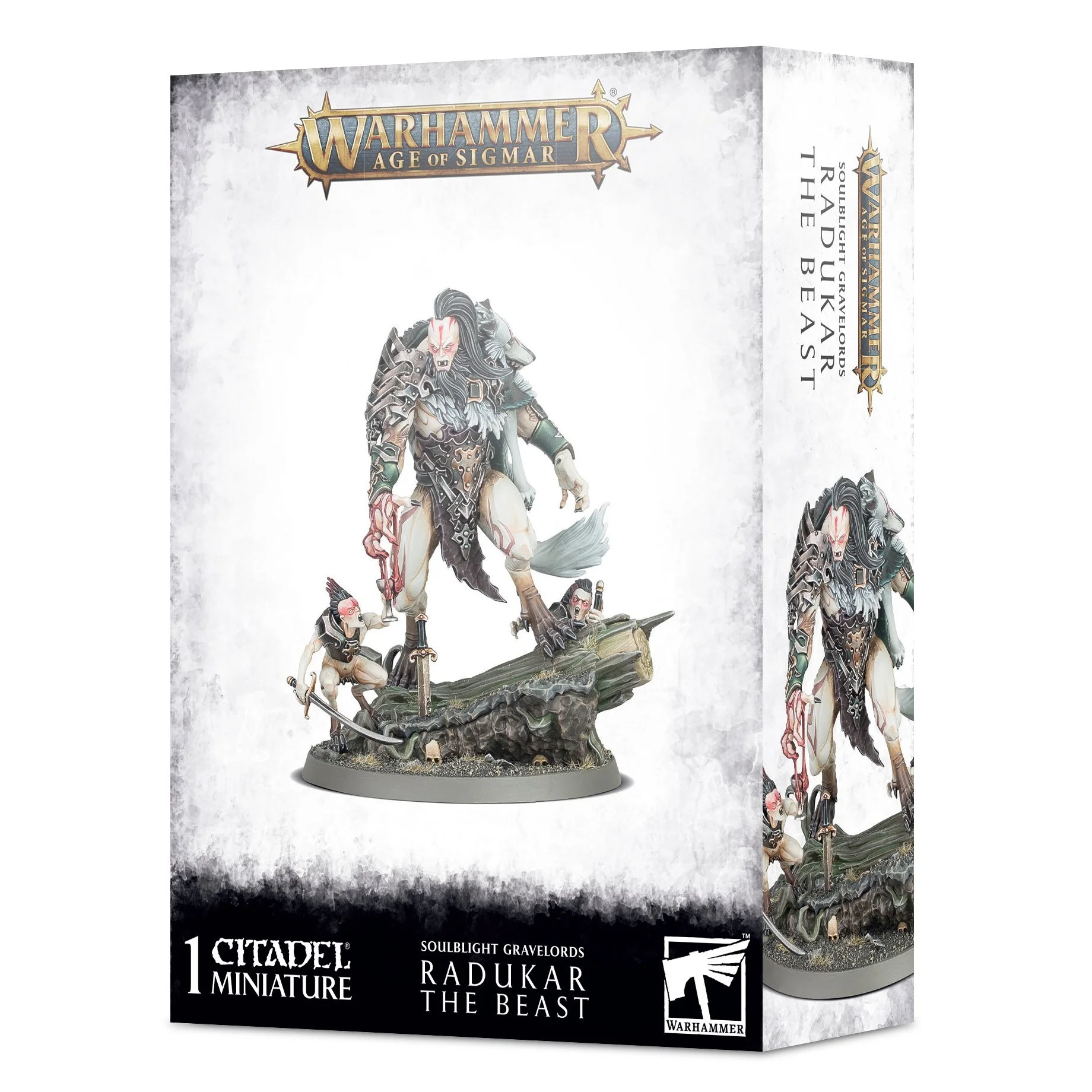 This 29-part plastic kit makes one Radukar the Beast model (with two accompanying Vyrkos Blood-born) and comes supplied with a Citadel 60mm Round Base.