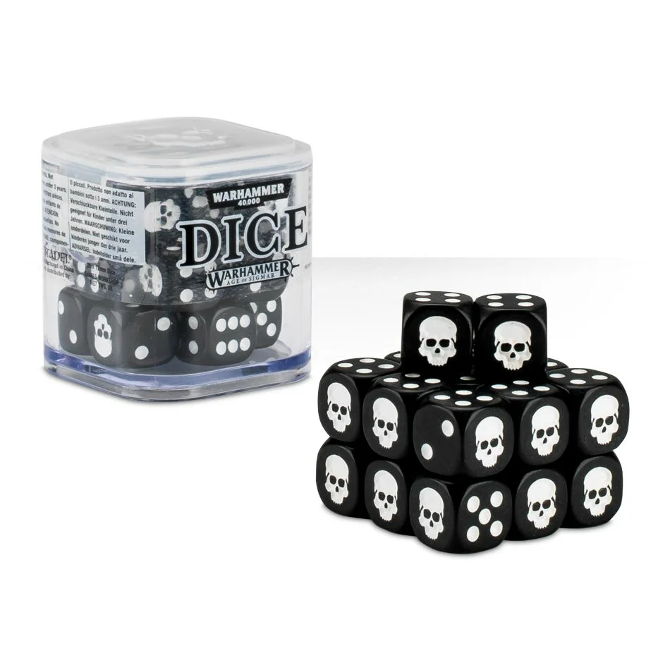 A hard-wearing, tough plastic cube containing 20 black 12mm dice with skull icons in place of the 1, this dice cube features an embossed skull lid (you can never have too many skulls, after all) and is stackable – create your very own multicoloured henge of dice!
