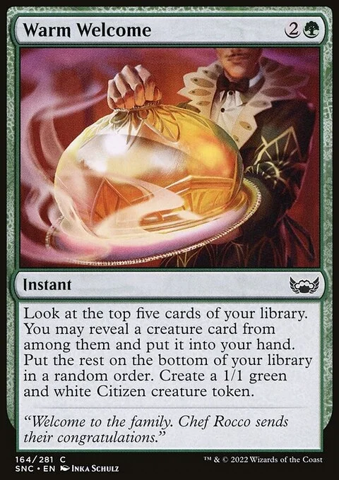 Look at the top five cards of your library. You may reveal a creature card from among them and put it into your hand. Put the rest on the bottom of your library in a random order. Create a 1/1 green and white Citizen creature token.