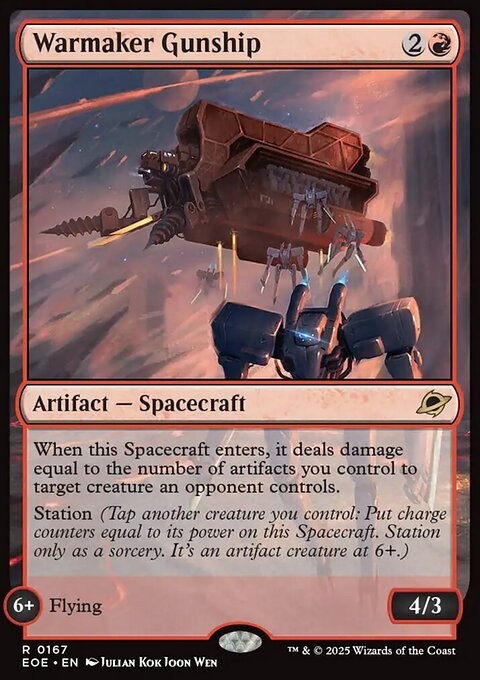 When this Spacecraft enters, it deals damage equal to the number of artifacts you control to target creature an opponent controls.